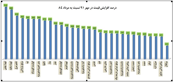 همه اینها در حالی است که دولت با وضع و تحمیل 5 درصد مالیات ارزش افزوده، در اصل این مبلغ را از جیب همین مزدبگیران فقیر که نه زیر خط فلاکت می رباید. به نمودار زیر دقت کنید، آمار بانک مرکزی رژیم ولایت فقیه نشان می دهد که 30 ماده خوراکی پرمصرف خانوارهای ایرانی از ابتدای دولت احمدی نژاد، این پادوی برکشیده رهبر و ولی فقیه رژیم، تا مهرماه سال 91 به طور متوسط 309 درصد گران شده اند. به عنوان مثال در بازه زمانی مرداد 84 تا مهر 91، اقلامی چون تخم مرغ، برنج و گوشت حدود 400 درصد گران شده اند.